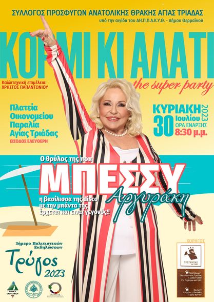 Ο Θρύλος της pop, η Βασίλισσα της disco, Μπέσσυ Αργυράκη, καταφθάνει στην Αγία Τριάδα με τη μπάντα της στο πιο νοσταλγικό και ξέφρενο γεγονός του καλοκαιριού! Όπως παλιά, στην φημισμένη παραλία της Αγίας Τριάδας!