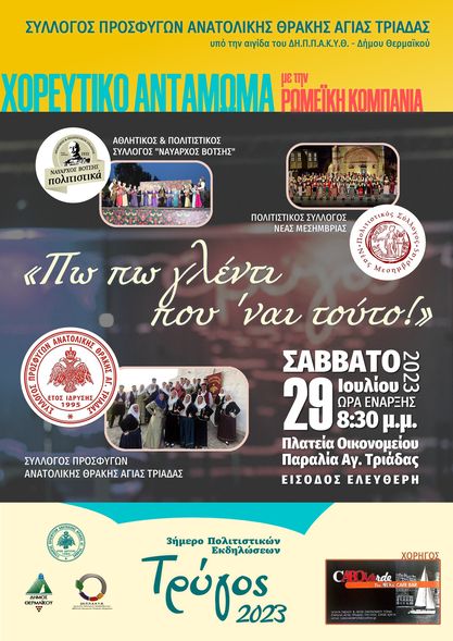 Ενα τριήμερο πολιτιστικών εκδηλώσεων γεμάτο μουσικές, χορό και μπόλικο κέφι! Παραδοσιακοί χοροί, νησιώτικη βραδιά και ξέφρενο πάρτι με τη θρυλική Μπέσσυ Αργυράκη, στην πιο ζωντανή και κεφάτη καλοκαιρινή διοργάνωση του Δήμου Θερμαϊκού!