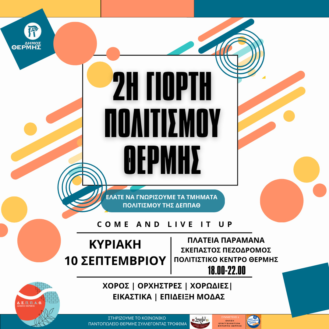 Κυριακή 10 Σεπτεμβρίου – «2 Η Γιορτή Πολιτισμού Θέρμης» της ΔΕΠΠΑΘ – Σκεπαστός Πεζόδρομος & Πλατεία Παραμάνα Θέρμης – 19.00 με 21.00.
