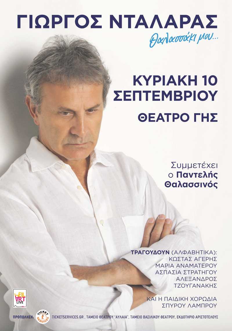 Ο Γιώργος Νταλάρας έρχεται με μια μεγάλη παραγωγή την Κυριακή 10 Σεπτεμβρίου στο Θέατρο ΓΗΣ στην Θεσσαλονίκη για μία συναυλία αφιερωμένη στην Θάλασσα, μετά την αναβολή της τον Ιούνιο λόγω καιρικών συνθηκών. Λάτρης της θάλασσας, με διαρκή μελέτη και αναζήτηση στη μουσική ανθολογεί λόγια και μουσικές που την ύμνησαν. Η αγάπη του Γιώργου Νταλάρα για τη θάλασσα είναι μεγάλη. Το δικό του «Θαλασσάκι…» δεν είναι απλά ο τίτλος μιας συναυλίας. Είναι η εξομολόγηση ενός καλλιτέχνη που πιστεύει βαθιά ότι «Εμείς οι Έλληνες και αρκετοί γειτονικοί μας λαοί χρωστάμε στη θάλασσα την ύπαρξή μας. Η σαγήνη, το δέος, η δύναμη της, μας έκαναν σπουδαίους». Για αυτή την αγάπη του δημιούργησε μια παράσταση με τα αγαπημένα μας τραγούδια για την θάλασσα συνοδευμένα από μαγικές εικόνες. Μια παράσταση που δεν είναι απλά μια συναυλία αλλά μια εμπειρία, ένα θαλασσινό ταξίδι. Με συνταξιδιώτες νέους ταλαντούχους καλλιτέχνες που τραγουδούν μαζί του, με μια εκπληκτική παιδική χορωδία και με τους κορυφαίους μουσικούς που τον συνοδεύουν πάντα. Μετά τις ιδιαίτερα επιτυχημένες συναυλίες σε Αθήνα και Κύπρο, το νέο ραντεβού στην Θεσσαλονίκη ορίστηκε για τις 10 Σεπτεμβρίου.