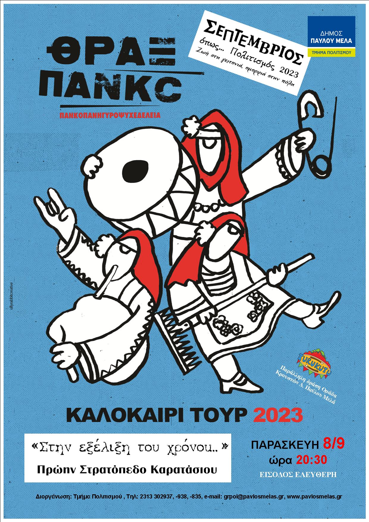 Με τρεις εκρηκτικές μουσικές συναυλίες συνεχίζονται οι εκδηλώσεις «Σεπτέμβριος όπως… Πολιτισμός 2023» του Δήμου Παύλου Μελά, στο πρώην στρατόπεδο Καρατάσιου. Η ΕΙΣΟΔΟΣ ΕΙΝΑΙ ΕΛΕΥΘΕΡΗ ΓΙΑ ΟΛΕΣ ΤΙΣ ΕΚΔΗΛΩΣΕΙΣ.