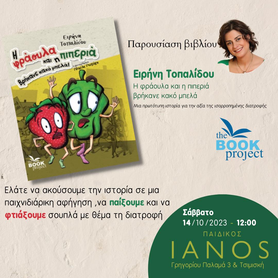 Τo Σάββατο 14 Οκτωβρίου στις 12:00 η Αλυσίδα Πολιτισμού IANOS και οι Εκδόσεις The Book Project, διοργανώνουν παρουσίαση του βιβλίου «Η φράουλα και η πιπεριά βρήκανε κακό μπελά!» της Ειρήνης Τοπαλίδου. Ένα πρωτότυπο βιβλίο που μας μιλάει για την ισορροπημένη διατροφή.