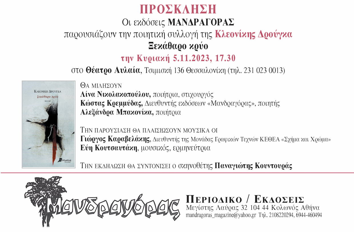 Την Κυριακή 5 Νοεμβρίου 2023, και ώρα 17.30 στο Θέατρο Αυλαία, Θεσσαλονίκης (Τσιμισκή 136) παρουσιάζεται η νέα ποιητική συλλογή της Κλεονίκης Δρούγκα, ξεκάθαρο κρύο. Για το βιβλίο θα μιλήσουν οι: Λίνα Νικολακοπούλου: ποιήτρια, στιχουργός, Κώστας Κρεμμύδας: εκδότης περ. «Μανδραγόρας» και η ποιήτρια Αλεξάνδρα Μπακονίκα. Θα διαβάσουν ποιήματα οι ηθοποιοί του ΚΘΒΕ Ελευθερία Τέτουλα και Δημήτρης Τσιλινίκος. Την εκδήλωση θα πλαισιώσουν οι μουσικοί Γιώργος Καραβελάκης, Διευθυντής της Μονάδας Γραφικών Τεχνών ΚΕΘΕΑ «Σχήμα και Χρώμα» και Εύη Κουτσαυτάκη. Θα συντονίσει ο σκηνοθέτης Παναγιώτης Κουντουράς