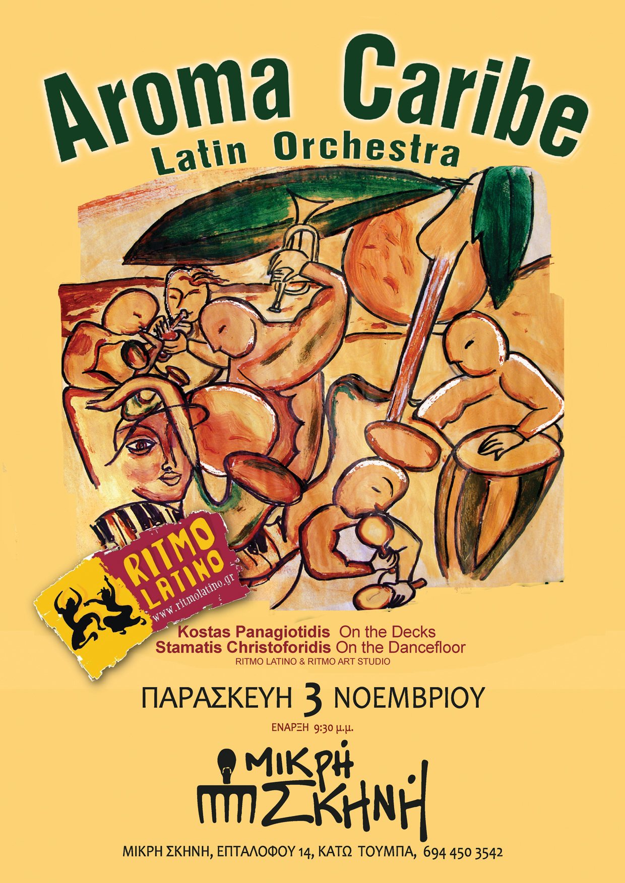 Οι επιτυχημένες βραδιές Latin live Party, της Μικρής Σκηνής, συνεχίζονται την Παρασκευή 3 Νοεμβρίου 2023 για τους λάτρεις της latin μουσικής και του χορού, σε μια μουσική και χορευτική βραδιά με τους μοναδικούς Aroma Caribe Latin Orchestra, τη μακροβιότερη latin μπάντα της Θεσσαλονίκης, η οποία θα μας ταξιδέψει με ρυθμούς και μελωδίες Cumbia, Mambo, Salsa, Cha cha στις χώρες της Λατινικής Αμερικής, για μια νύχτα με κέφι και πολύ χορό. Θα ακολουθήσει latin party με τον dj Kostas Panagiotidis και τον Stamatis Christoforidis στο dancefloor, με την υποστήριξη του Ritmo Art Studio και του Ritmo Latino Radio.