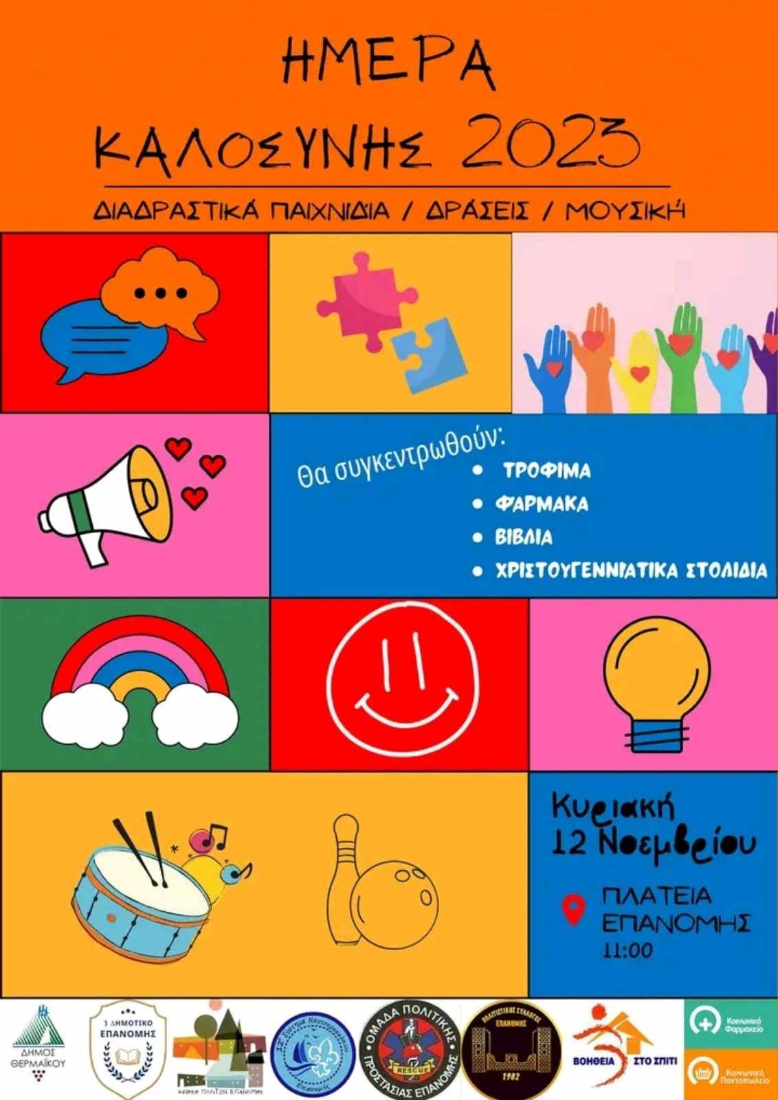 Με αφορμή την Παγκόσμια Ημέρα Καλοσύνης, φορείς και ομάδες της Επανομής διοργανώνουν την Ημέρα Καλοσύνης 2023. H εκδήλωση θα λάβει χώρα στις 12 Νοεμβρίου στην πλατεία Επανομής και ώρα 11:00. Η δράση αφορά την κινητοποίηση των δημοτών, μικρών και μεγάλων, σε θέματα εθελοντισμού και προσφοράς. Η εκδήλωση θα πλαισιωθεί με διαδραστικά παιχνίδια, δράσεις και μουσική. Κατά τη διάρκεια της εκδήλωσης θα συλλεχθούν φαρμάκα, είδη προσωπικής υγιεινής, τρόφιμα, βιβλία, καθώς και Χριστουγεννιάτικα στολίδια.