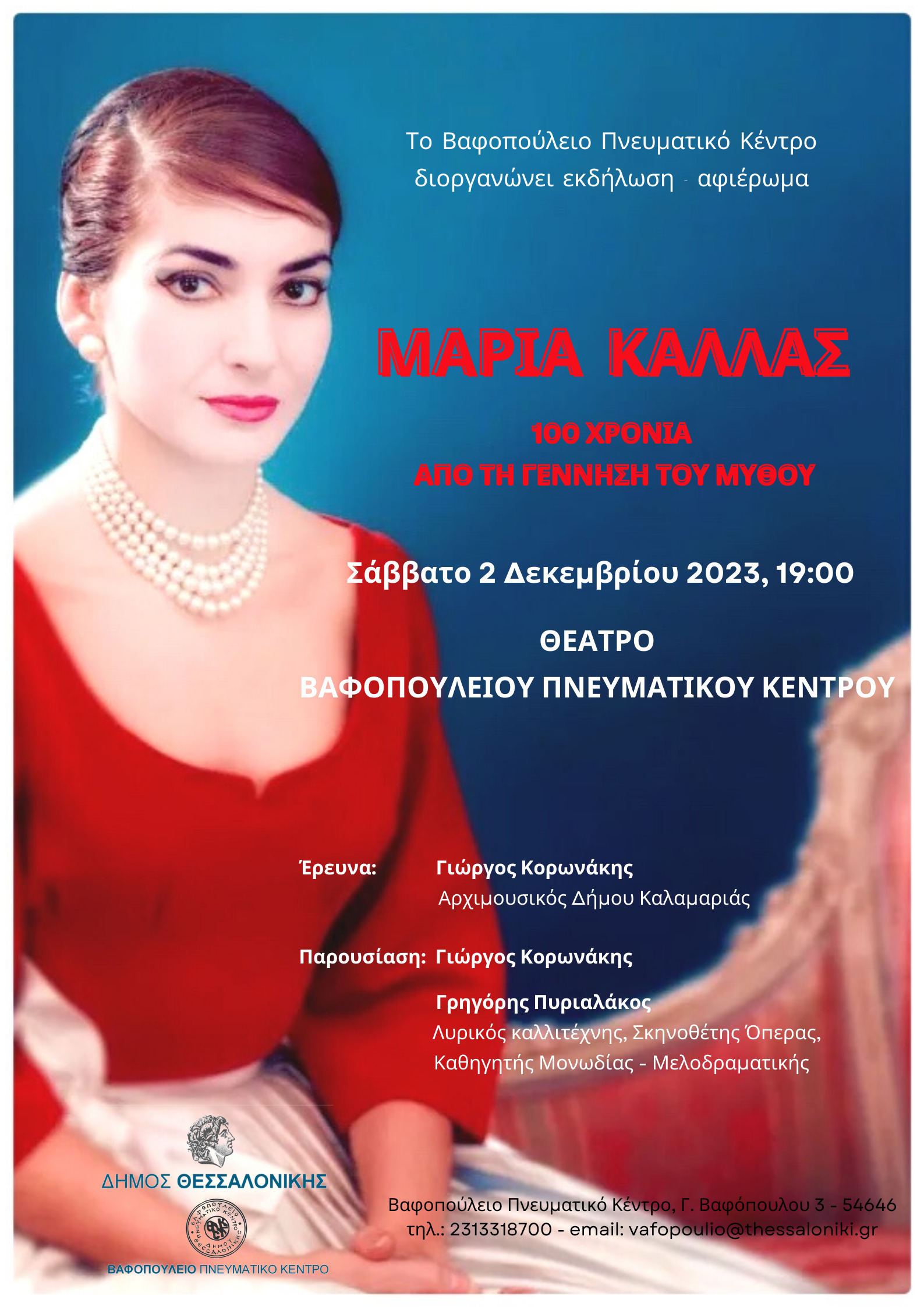 Επετειακή εκδήλωση – αφιέρωμα με τίτλο «Μαρία Κάλλας: 100 χρόνια από τη γέννηση του μύθου» διοργανώνει το Βαφοπούλειο Πνευματικό Κέντρο το Σάββατο 2 Δεκεμβρίου 2023 στις 19:00.