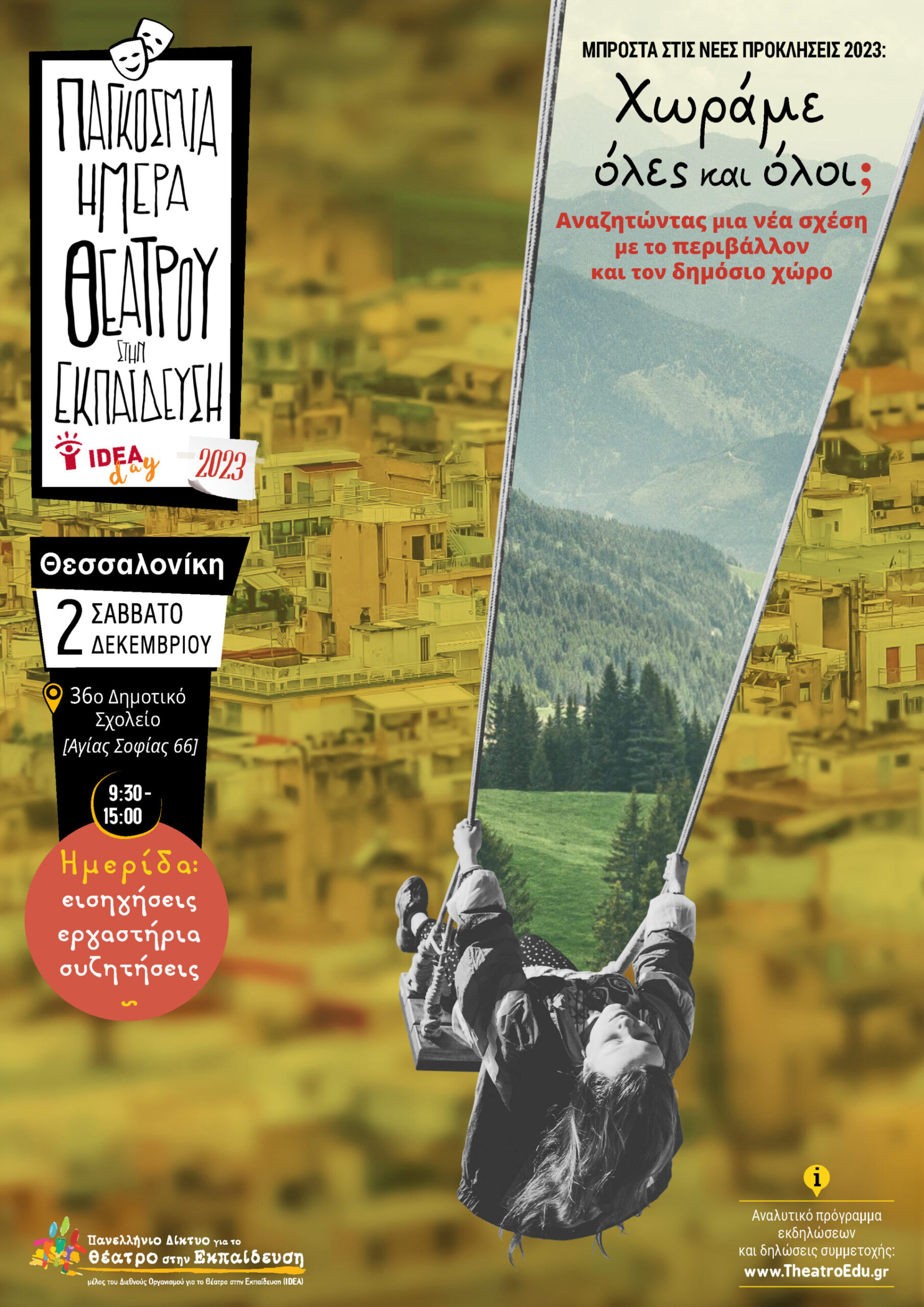 Το Πανελλήνιο Δίκτυο για το Θέατρο στην Εκπαίδευση, τακτικό μέλος του IDEA, συμμετέχει και φέτος στον εορτασμό διοργανώνοντας ημερίδες σε διάφορες πόλεις της χώρας στο διάστημα μεταξύ 24 Νοεμβρίου και 3 Δεκεμβρίου 2023. Στη Θεσσαλονίκη η ημερίδα θα πραγματοποιηθεί το Σάββατο 2 Δεκεμβρίου 2023, μεταξύ 09:30 και 15:00, στο 36ο Δημοτικό Σχολείο, Αγίας Σοφίας 66 και θα περιλαμβάνει εργαστήρια και εισηγήσεις.