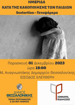 Το Τμήμα Προγραμμάτων & Δια Βίου Μάθησης του Δήμου Θεσσαλονίκης σε συνεργασία με εξειδικευμένους επιστήμονες θα πραγματοποιήσει ημερίδα με τίτλο «Τι είναι η παιδική κακοποίηση; Νέες μορφές κακοποίησης και διαδίκτυο: Sextortion, Catfishing» την Παρασκευή 01 Δεκεμβρίου 2023 ώρα 18:00 στην Αίθουσα Μ. Αναγνωστάκης στο Δημαρχείο.