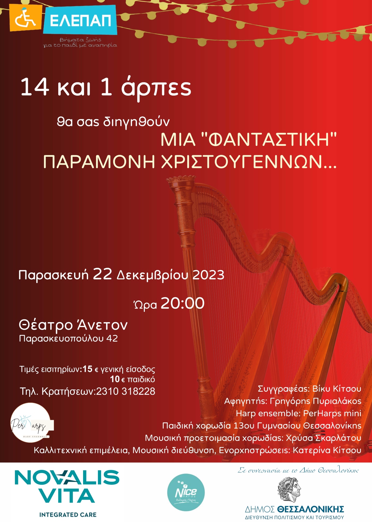 Μία «φανταστική» Παραμονή Χριστουγέννων για μικρούς και μεγάλους, θα μας αφηγηθεί η ομάδα “PerHaps”, την Παρασκευή 22 Δεκεμβρίου, ώρα 20:00, στο Θέατρο Άνετον (Παρασκευοπούλου 42). Ένα σύνολο από νεαρούς αρπίστες, 7-20 χρονών από τη Θεσσαλονίκη, με τις πινελιές του όμποε και της τρομπέτας, θα μας ταξιδέψει με μελωδίες από Ιρλανδία, Χριστουγεννιάτικα τραγούδια και μουσικές, από την Μπαρόκ εποχή μέχρι το σήμερα, πλαισιωμένο από την παιδική χορωδία του 13ου Γυμνασίου Θεσσαλονίκης, υπό τη διεύθυνση της Κατερίνας Κίτσου. Μία βόλτα στο δάσος μπορεί να είναι μια όμορφη, ήσυχη ημέρα μέσα στη φύση, που ονειρευόταν πάντα ο μικρός μας πρωταγωνιστής να ζήσει. Μήπως όμως αυτήν την Παραμονή Χριστουγέννων, θα μετατραπεί σε ένα περιπετειώδες ταξίδι γεμάτο νέες εμπειρίες, εικόνες παραμυθένιες, ουράνιες μελωδίες και μυστήρια συναπαντήματα με τα πλάσματα του δάσους; Πόσο «φανταστική» ήταν τελικά αυτή η Παραμονή Χριστουγέννων;