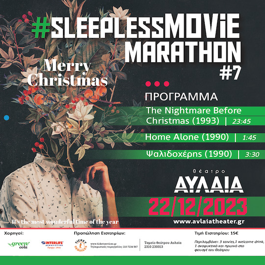 Το ζητήσατε με κάθε τόνο και το project Sleepless Movie Marathon η απόλυτη κινηματογραφική εμπειρία μετά από συνεχόμενα sold out επιστρέφει στο θέατρο Αυλαία τη σεζόν 2023-2024 για τρεις νύχτες γεμάτες κινηματογράφο. Τα εορταστικό Sleepless Movie Marathon την Παρασκευή 22 Δεκεμβρίου παρουσιάζει τρεις εμβληματικές χριστουγεννιάτικες ταινίες που έμειναν στην ιστορία του κινηματογράφου η καθεμία για το δικό της λόγο. Ταινίες που επιβάλλεται να τις βλέπουμε κάθε χρόνο για να σημάνουν Χριστούγεννα. Το 7ο Sleepless Movie Marathon, στην μεταμεσονύκτια σκηνή του ΑΥΛΑΙΑ θέλει να σπάσει τις καρδιές μας πριν χτυπήσουν οι καμπάνες για Χριστούγεννα! Ένα μοναδικό εικαστικό αριστούργημα, το The Nightmare Before Christmas (1993) του Τιμ Μπάρτον ανοίγει την γιορτινή κινηματογραφική βραδιά προσφέροντας μας μια ξεχωριστή εορταστική αισθητική. Στη συνέχεια το κοινό θα παρακολουθήσει την απόλυτη χριστουγεννιάτικη ταινία Home Alone (1990) του Κρις Κολόμπους, που όσες φορές και να την παρακολουθήσουμε δεν θα σταματάει να μας αιχμαλωτίζει, ενώ η αυλαία κλείνει με τον Ψαλιδοχέρη (1990) πάλι του Τιμ Μπάρτον παρακολουθώντας τον Έντουαρντ ένα μηχανικό ον με ανθρώπινο μυαλό, συναισθήματα και βιολογικές ανάγκες, που έμεινε ατελείωτο από τον εφευρέτη του.