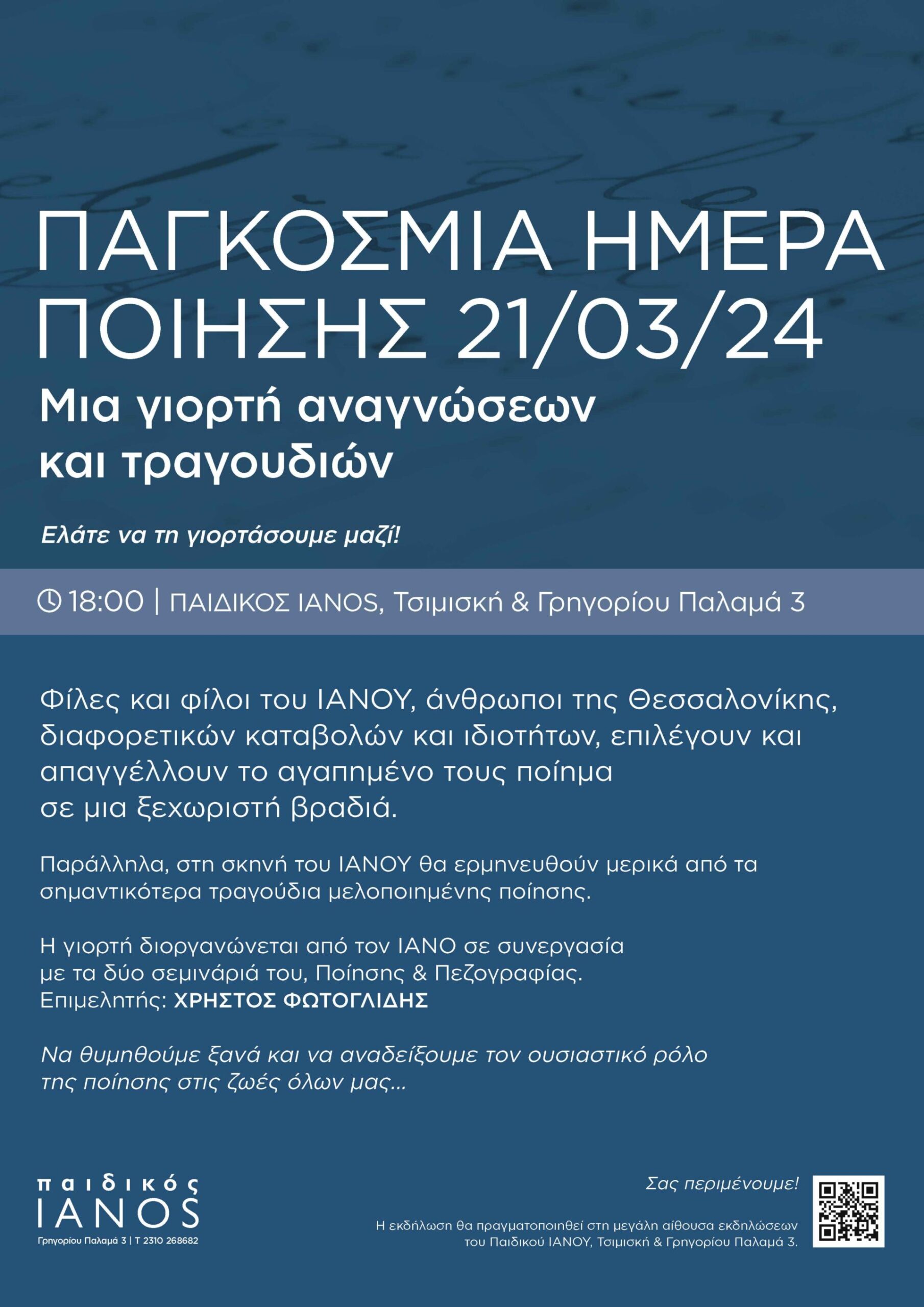 Θα μας τιμήσει ιδιαιτέρως η παρουσία σας σ’ αυτήν τη γιορτή της Ποίησης και σε μια βραδιά συνδεδεμένη βαθιά με τον Ιανό και την ιστορία του.