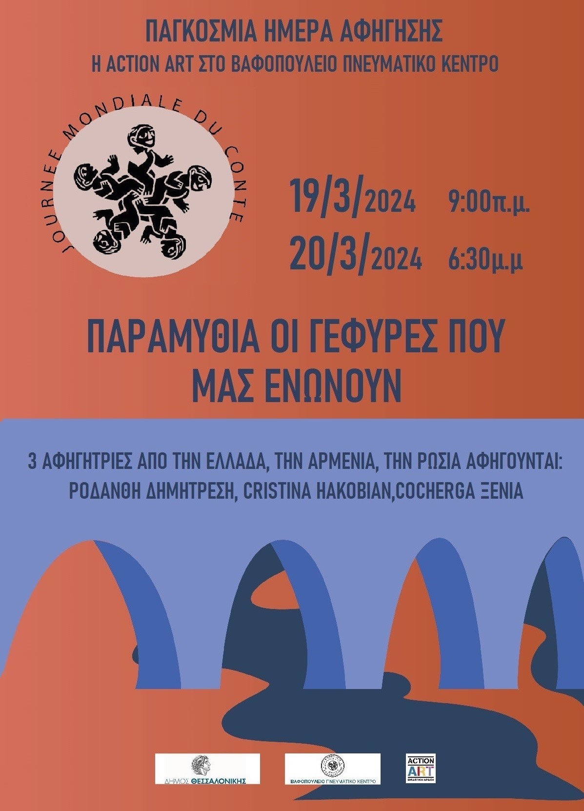 19 Μαρτίου στις 9:00π.μ. για μαθητές σχολείων | 20 Μαρτίου στις 18:30 η Κεντρική εκδήλωση | 3 Αφηγήτριες από την Ελλάδα, την Αρμενία, τη Ρωσία αφηγούνται: Ροδάνθη Δημητρέση, Cristina Hakobian, Cocherga Ξένια.