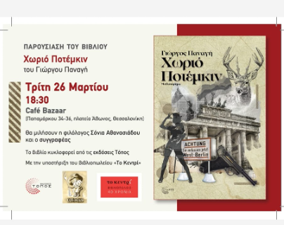 Ελάτε μαζί μας στη βιβλιοπαρουσίαση του μυθιστορήματος “Χωριό Ποτέμκιν” (εκδόσεις Τόπος) στο Cafe’ Bazaar (Παπαμάρκου 34-36, Πλατεία Άθωνος, Θεσσαλονίκη) στις 26 Μαρτίου 2024 στις 18:30 το βράδυ. Μεταξύ άλλων θα συζητηθούν: η “μυθολογία” της πόλης του Βερολίνου από τον προηγούμενο αιώνα μέχρι σήμερα, οι υπαρξιακές ρίζες του 20ου και του 21ου αιώνα, το αδιόρατο αποτύπωμα της Ιστορίας στην καθημερινότητα των ανθρώπων και άλλα ενδιαφέροντα. Το βιβλίο θα παρουσιάσουν ο συγγραφέας του και η φιλόλογος Σόνια Αθανασιάδου.