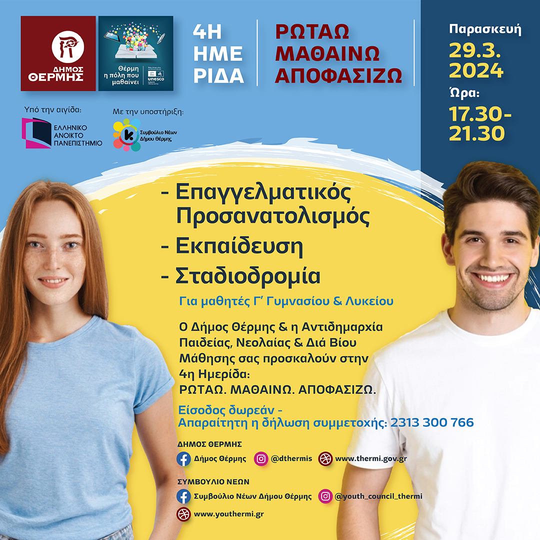 Ο ∆ήµος Θέρµης & η Αντιδηµαρχία Παιδείας, Νεολαίας & ∆ιά Βίου Μάθησης, υπό την αιγίδα του Ελληνικού Ανοικτού Πανεπιστημίου, για 4η συνεχόμενη χρονιά, σας προσκαλούν και φέτος στην Ημερίδα «ΡΩΤΑΩ. ΜΑΘΑΙΝΩ. ΑΠΟΦΑΣΙΖΩ.» με θέμα τον Επαγγελματικό Προσανατολισμό, την Εκπαίδευση και τη Σταδιοδρομία, η οποία θα διεξαχθεί την Παρασκευή 29 Μαρτίου 2024 και ώρα 17.30 – 21.30 στο «Αμφιθέατρο» του Κέντρου Διάδοσης Επιστημών & Μουσείου Τεχνολογίας – ΝΟΗΣΙΣ.