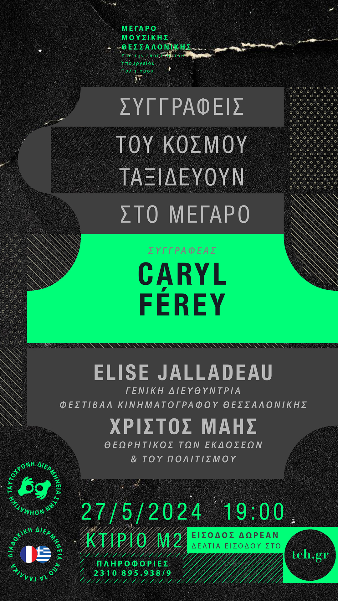 Στο πλαίσιο του θεσμού «Συγγραφείς του κόσμου ταξιδεύουν στο Μέγαρο», την Δευτέρα 27 Μαΐου στις 7.00 μ.μ., καλεσμένος είναι ο συγγραφέας Caryl Férey (Καρύλ Φερέ). O Caryl Férey θεωρείται ένας από τους κυριότερους εκπροσώπους του νουάρ γαλλικού μυθιστορήματος. Τα βιβλία του επικεντρώνονται στην παρουσίαση ενός βίαιου, σκοτεινού, πολύπλοκου κόσμου, όπου το σασπένς αναμειγνύεται με την κοινωνιολογία, την οικονομία και την ανθρωπογεωγραφία αποκαλύπτοντας αδυσώπητες αλήθειες. Πρόκειται για αστυνομικά μυθιστορήματα που συνδυάζουν την κοινωνική κριτική και την αποτύπωση της πραγματικότητας. «Πάντα νιώθω στο πλευρό των καταπιεσμένων», δήλωσε ο συγγραφέας το 2017.