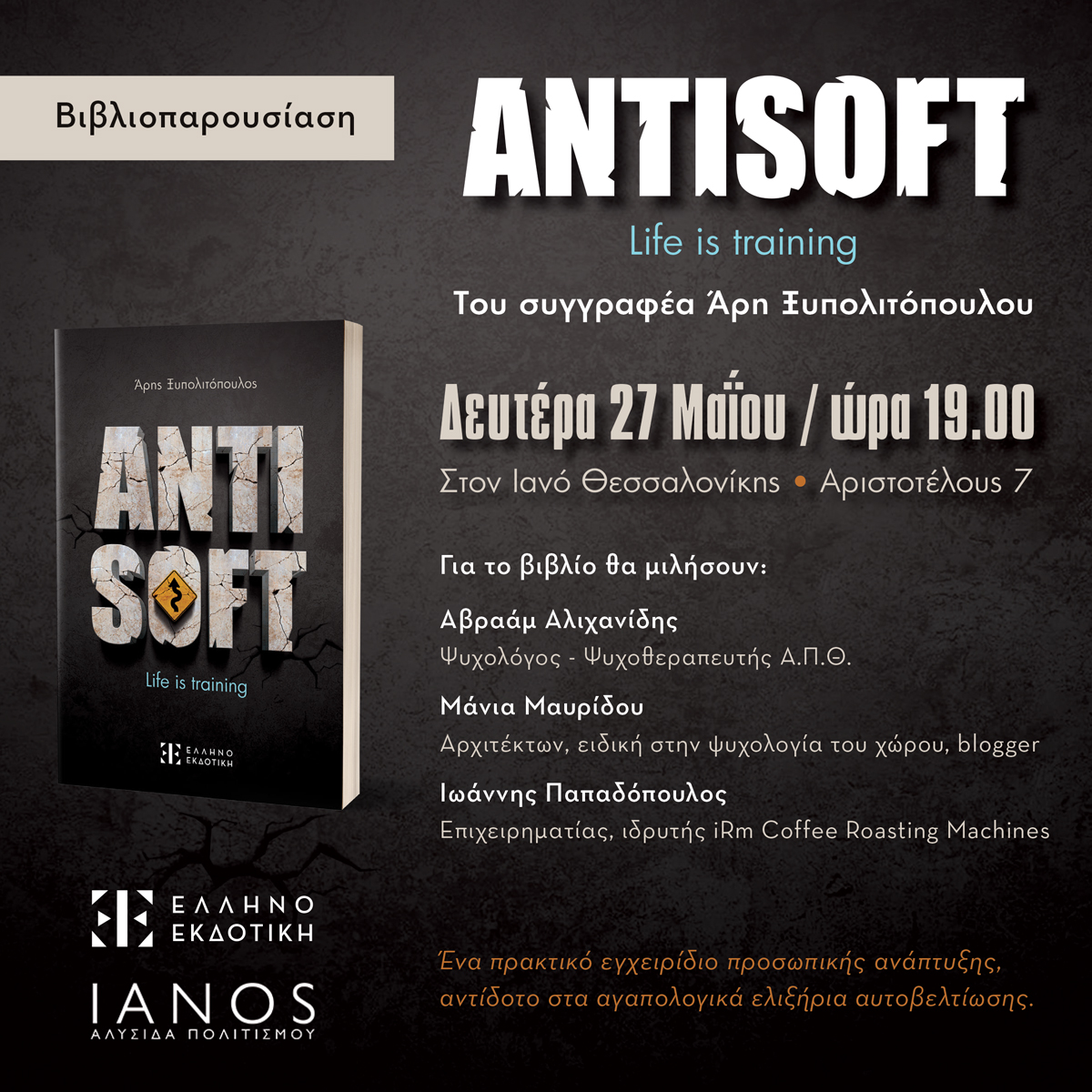 Την Δευτέρα 27 Μαΐου στις 7 μ.μ στον Ιανό Αριστοτέλους η ΕΛΛΗΝΟΕΚΔΟΤΙΚΗ παρουσιάζει στο κοινό της Θεσσαλονίκης το ‘ANTISOFT’, το νέο βιβλίο του Θεσσαλονικιού business coach και συγγραφέα Άρη Ξυπολιτόπουλου. Το ‘ANTISOFT’ είναι ένα πολύ διαφορετικό και σκληροτράχηλο αφήγημα προσωπικής ανάπτυξης που φιλοδοξεί να γίνει ένα νέο σημείο αναφοράς στην λογοτεχνία της αυτοβελτίωσης.