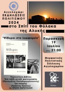 Η Κινηματογραφική Λέσχη Θεσσαλονίκης [ΚΛΘ] και ο Μορφωτικός & Πολιτιστικός Σύλλογος Αγγελοχωρίου, σε συνεργασία με τον εκδοτικό οίκο University Studio Press, παρουσιάζουμε για πρώτη φορά το βιβλίο των Παναγιώτη Παπαδημητρόπουλου και Χρήστου Τζιώκου ΨΙΘΥΡΟΙ ΣΤΟ ΛΕΩΦΟΡΕΙΟ [2024 εκδόσεις University Studio Press, 64 σελίδες], την Παρασκευή 19 Ιουλίου 2024, 9:00μμ, «δίπλα στο κύμα», στο Σπίτι του Φύλακα της Αλυκής [στην παραλία Αγγελοχωρίου, τηλ. 6931-841749]. Την πρώτη αυτή παρουσίαση με φόντο το ηλιοβασίλεμα προλογίζει ο κριτικός κινηματογράφου, μέλος της Π.Ε.Κ.Κ., Κώστας Γ. Καρδερίνης. Παράλληλα με την παρουσίαση προβάλλονται φωτογραφίες του Παναγιώτη Παπαδημητρόπουλου. Ποιήματα διαβάζουν ο Χρήστος Τζιώκος και ο Παναγιώτης Παπαδημητρόπουλος. Τρομπέτα, σε πρωτότυπες συνθέσεις του, παίζει ο Δημήτρης Δαλέζης. Μετά την παρουσίαση ακολουθεί συζήτηση με το κοινό.