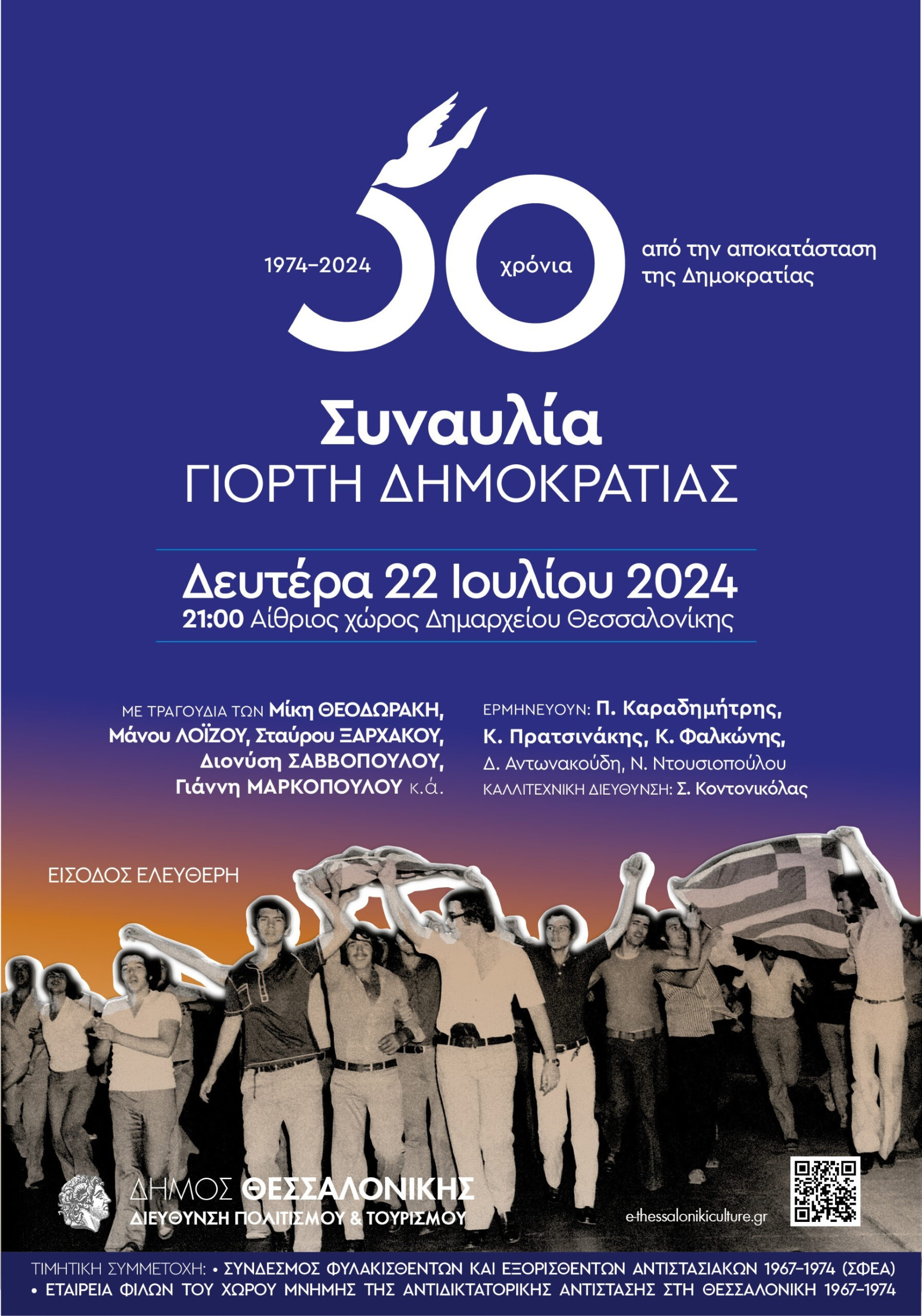 Ο Δήμος Θεσσαλονίκης, με αφορμή την επέτειο των 50 χρόνων από την αποκατάσταση της Δημοκρατίας στην Ελλάδα, διοργανώνει εκδήλωση με τίτλο «Γιορτή Δημοκρατίας» τη Δευτέρα 22 Ιουλίου 2024, στις 21:00, στο Αίθριο του Δημαρχείου Θεσσαλονίκης, με ελεύθερη είσοδο.