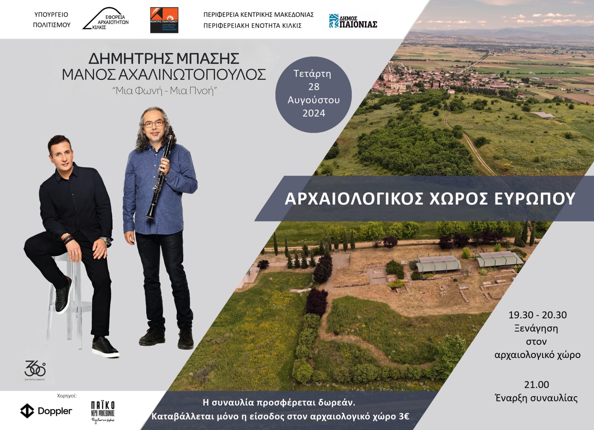 Η Εφορεία Αρχαιοτήτων Κιλκίς συνδιοργανώνει με το Κέντρο Πολιτισμού Περιφέρειας Κεντρικής Μακεδονίας, την Αντιπεριφέρεια Κιλκίς και τον Δήμο Παιονίας τη συναυλία “Μια Φωνή – Μια Πνοή” με τους Δημήτρη Μπάση και Μάνο Αχαλινωτόπουλο στον αρχαιολογικό χώρο αρχαίας Ευρωπού, την γενέτειρα του Σέλευκου Α’ Νικάτορα.