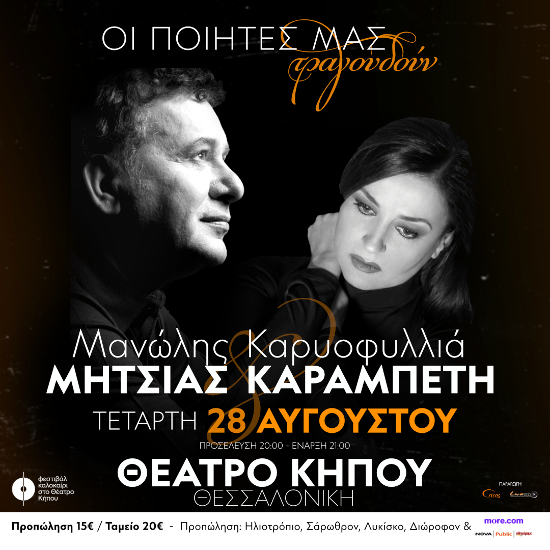 Μετά τις επιτυχημένες soldout συναυλίες του χειμώνα, ο Μανώλης Μητσιάς και η Καρυοφυλλιά Καραμπέτη περιδιαβαίνουν ξανά τον μαγικό κόσμο της ελληνικής ποίησης παρουσιάζοντας στο θέατρο Κήπου, την Τετάρτη 28 Αυγούστου 2024, ένα ανανεωμένο πρόγραμμα που περιλαμβάνει έργα σπουδαίων Ελλήνων ποιητών και στιχουργών, που έχουν μελοποιήσει οι συνθέτες Μίκης Θεοδωράκης, Μάνος Χατζιδάκις, Σταύρος Ξαρχάκος, Δήμος Μούτσης, Ηλίας Ανδριόπουλος, Θάνος Μικρούτσικος, Χρήστος Λεοντής, και Γιάννης Σπανός.