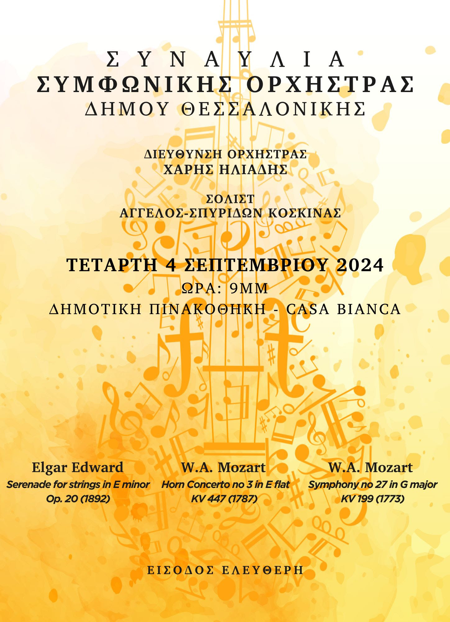 Η Συμφωνική Ορχήστρα του Δήμου Θεσσαλονίκης, υπό τη μουσική διεύθυνση του αρχιμουσικού Χάρη Ηλιάδη, παρουσιάζει την Τετάρτη 4 Σεπτεμβρίου στις 21.00 (Προσέλευση κοινού: 20.30), στον κήπο της Δημοτικής Πινακοθήκης – Casa Bianca, (Λεωφόρος Βας. Όλγας 182 και Θεμ. Σοφούλη) συναυλία με έργα των Edward Elgar και W.A. Mozart. Σολίστ: Άγγελος-Σπυρίδων Κοσκινάς (γαλλικό κόρνο).