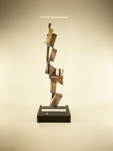 [… αυτά τα ακανόνιστα περι-γράμματα και οι ασυμμετρίες όγκων και επιπέδων, σαν τα κομμάτια ενός puzzle με την καθαρά δική του λογική συγκρότηση, θα μπορούσαν να αποτελέσουν προσωπικές διευκρινίσεις για την αντίληψη τοπίων και διαδρομών. Πρόκειται για μια χωρική συνύπαρξη σε διαδοχή, παρόμοια με τις ‘βυθομετρήσεις’ της σκέψης, όπου υπηρετείται μια εικαστική αίσθηση για τον χρόνο, ενώ ταυτόχρονα δηλώνεται και μια τοποχωρική στάση απέναντι στο χάος. ] (απόσπασμα από κείμενο της Θάλειας Στεφανίδου)