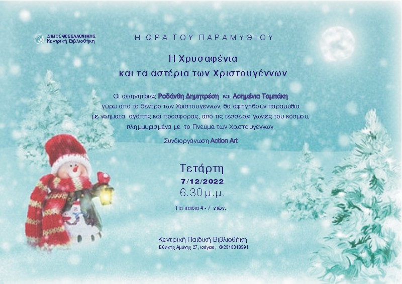 Αφήγηση Παραμυθιού «Η Χρυσαφένια και τα αστέρια των Χριστουγέννων» στην Κεντρική Δημοτική Βιβλιοθήκη Θεσσαλονίκης