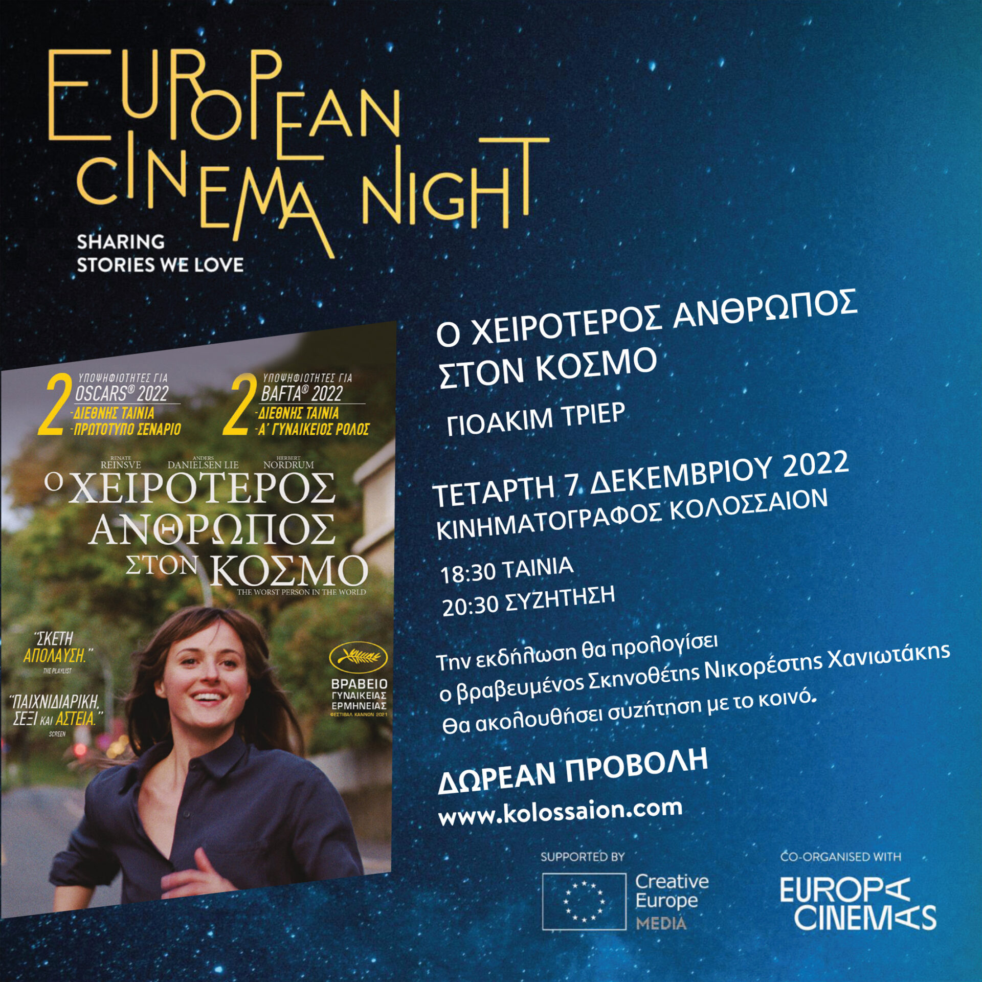 European Cinema Night 2022 Στο πλαίσιο της Ευρωπαϊκής Νύχτας Κινηματογράφου 2022, στη Θεσσαλονίκη στον κινηματογράφο ΚΟΛΟΣΣΑΙΟΝ (μέλος των Europa Cinemas), θα πραγματοποιηθεί την Τετάρτη 7 Δεκεμβρίου στις 6:30μ.μ. ΔΩΡΕΑΝ ΠΡΟΒΟΛΗ της ταινίας «Ο ΧΕΙΡΟΤΕΡΟΣ ΑΝΘΡΩΠΟΣ ΣΤΟΝ ΚΟΣΜΟ» του Γιοακίμ Τρίερ