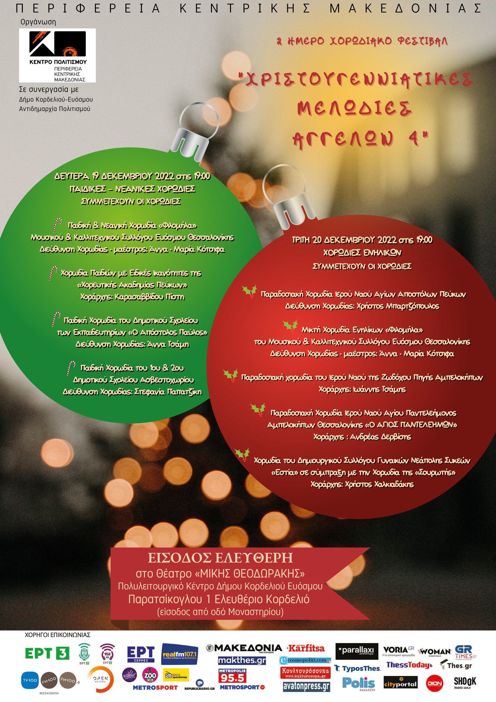 Φέρνοντας το πνεύμα των Χριστουγέννων, το Κέντρο Πολιτισμού της Περιφέρειας Κεντρικής Μακεδονίας σε συνεργασία με την Αντιδημαρχία Πολιτισμού του Δήμου Κορδελιού – Ευόσμου διοργανώνει το 2ήμερο Χορωδιακό Φεστιβάλ «Χριστουγεννιάτικες Μελωδίες Αγγέλων 4». Το χορωδιακό Φεστιβάλ παρουσιάστηκε για 1 η φορά το 2015 και συνεχίστηκε και για τις επόμενες δυο χρονιές με μεγάλη επιτυχία. Πρόκειται για ένα πολιτιστικό γεγονός, για την ανάδειξη του πολιτιστικού μας πλούτου στο οποίο θα απολαύσουν μικροί και μεγάλοι για 2 βραδιές, Χριστουγεννιάτικες μελωδίες από Χορωδίες Παιδικές, Νεανικές και ενηλίκων της Περιφέρειας μας. Το Θέατρο «ΜΙΚΗΣ ΘΕΟΔΩΡΑΚΗΣ» θα πλημμυρίσει από παιδικές και νεανικές φωνούλες την πρώτη ημέρα του φεστιβάλ καθώς και μελωδίες ενηλίκων την δεύτερη ημέρα όπου θα μας μεταφέρουν στην γιορτινή ατμόσφαιρα των Χριστουγέννων.