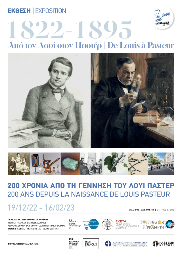 Το Γαλλικό Ινστιτούτο Θεσσαλονίκης με τη συνεργασία του Εθνικού Κέντρου ‘Έρευνας και Τεχνολογικής Ανάπτυξης (ΕΚΕΤΑ) υποδέχεται από τις 19 Δεκεμβρίου 2022 έως τις 16 Φεβρουαρίου 2023 την έκθεση με τίτλο «1822-1895 : Από τον Λουί στον Παστέρ», η οποία διοργανώθηκε από το Γαλλικό Ινστιτούτο Ελλάδος, σε συνεργασία με το Ελληνικό Ινστιτούτο Παστέρ και το Ινστιτούτο Παστέρ στο Παρίσι.