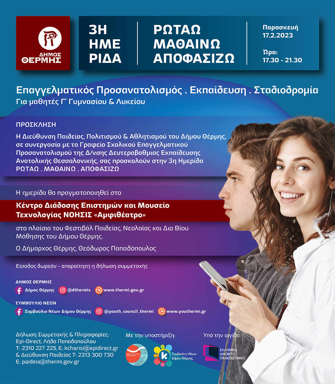 Η Διεύθυνση Παιδείας, Πολιτισμού & Αθλητισμού του Δήμου Θέρμης, σε συνεργασία με το Γραφείο Σχολικού Επαγγελματικού Προσανατολισμού της Δευτεροβάθμιας Εκπαίδευσης Ανατολικής Θεσσαλονίκης, διοργανώνει την 3η Ημερίδα «ΡΩΤΑΩ. ΜΑΘΑΙΝΩ. ΑΠΟΦΑΣΙΖΩ.» με θέμα τον Επαγγελματικό Προσανατολισμό, την Εκπαίδευση και τη Σταδιοδρομία, η οποία θα διεξαχθεί την Παρασκευή 17 Φεβρουαρίου, 17.30 – 21.30, στο «Αμφιθέατρο» του Κέντρου Διάδοσης Επιστημών & Μουσείου Τεχνολογίας “ΝΟΗΣΙΣ”.
