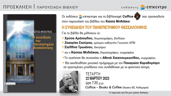 Οι εκδόσεις Επίκεντρο και το βιβλιοκαφέ Coffice σας προσκαλούν στην παρουσίαση του βιβλίου του Κώστα Μπλιάτκα: «Η συνείδηση του Πανεπιστημίου Θεσσαλονίκης»