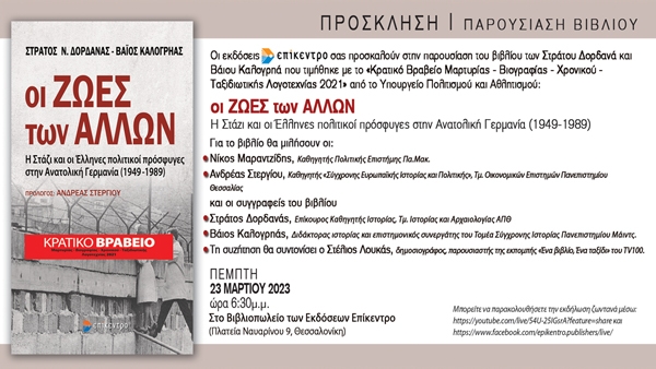Οι εκδόσεις Επίκεντρο σας προσκαλούν στην παρουσίαση του βιβλίου των Στράτου Δορδανά και Βάιου Καλογρηά που τιμήθηκε με το «Κρατικό Βραβείο Μαρτυρίας – Βιογραφίας – Χρονικού – Ταξιδιωτικής Λογοτεχνίας 2021» από το Υπουργείο Πολιτισμού και Αθλητισμού: «Οι Ζωές των Άλλων»