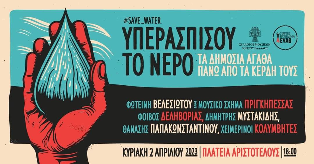 Με το σύνθημα «Υπερασπίσου το Νερό» ο Θανάσης Παπακωνσταντίνου, η Φωτεινή Βελεσιώτου, ο Φοίβος Δεληβοριάς, ο Δημήτρης Μυστακίδης και οι Χειμερινοί Κολυμβητές ενώνουν τις φωνές τους σε μια μοναδική ανοιχτή συναυλία, την Κυριακή 2 Απριλίου 2023 στις 18:00 στην Πλατεία Αριστοτέλους.