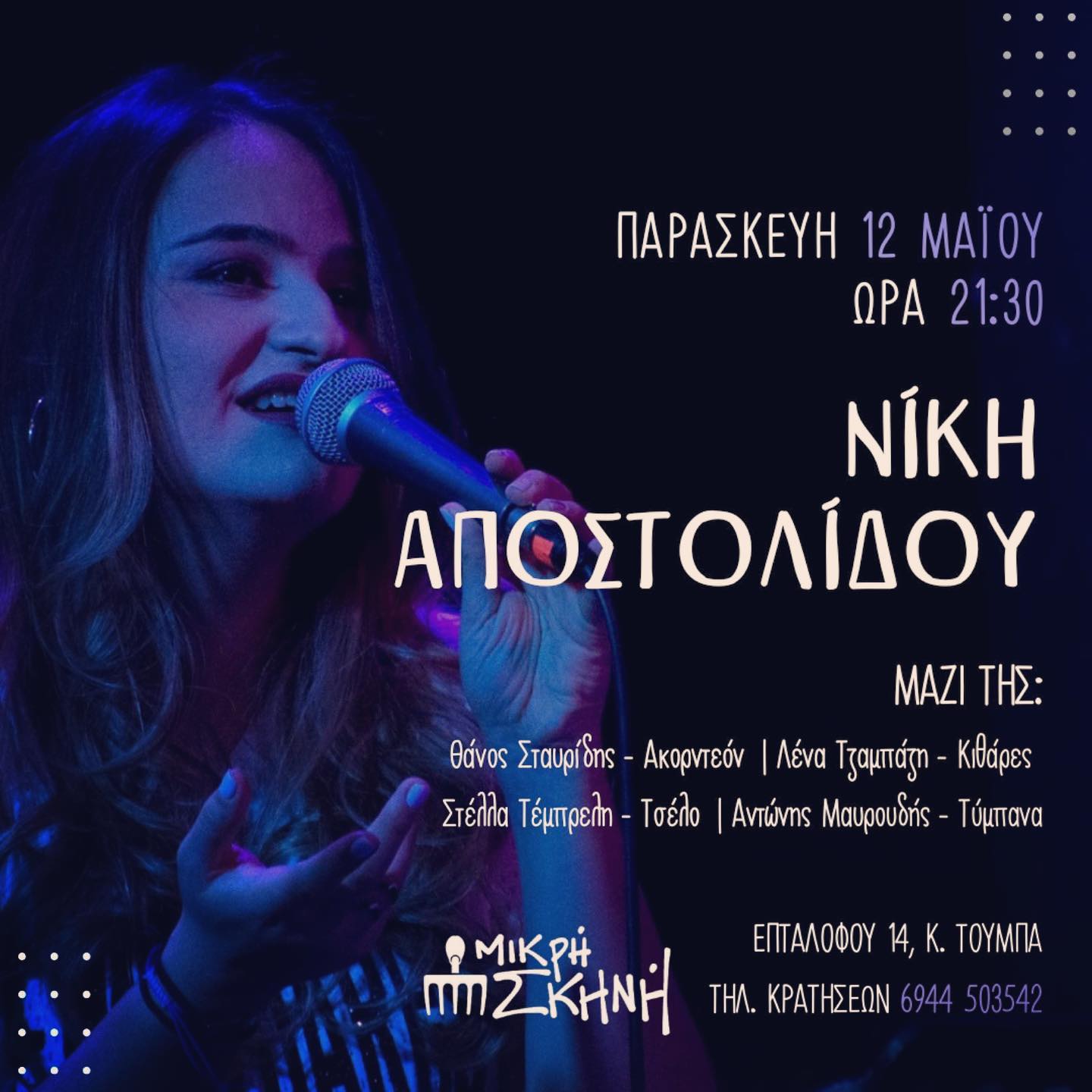 Η “Μικρή Σκηνή”, είναι το νέο πολιτιστικό στέκι της πόλης μας, Επταλόφου 14, στην Κ. Τούμπα, που έχει αγαπηθεί από τον κόσμο ήδη από την πρώτη περίοδο λειτουργίας του και παρουσιάζει την Παρασκευή 12 Μαΐου 2023, στις 21.30, τη Νίκη Αποστολίδου σε μια συναυλία με σύγχρονο ελληνικό τραγούδι.