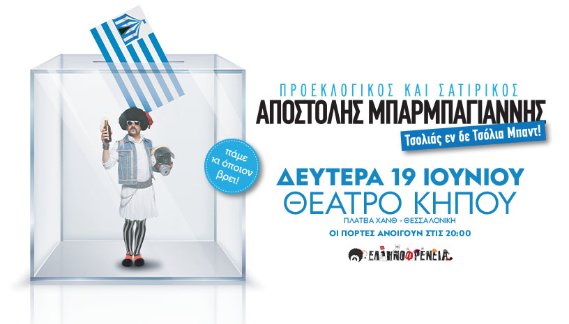 Ο Αποστόλης Μπαρμπαγιάννης έρχεται στο Θέατρο Κήπου στη Θεσσαλονίκη για μία και μοναδική, συλλεκτική, – άκρως προεκλογική- παράσταση, για να σατιρίσει τα κακώς κείμενα και υποκείμενα, σε ένα Stand-Up Comedy Show με ζωντανή ορχήστρα. Ο punk φουστανελάς, έρχεται με άγριες διαθέσεις, το εκλογικό βιβλιάριο στο χέρι και… όποιον βρει το βόλι! Πάμε κι όποιον βρει! Η απόλυτη προεκλογική παράσταση που δεν πρέπει να χάσεις!