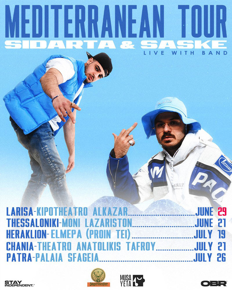 Sidarta και Saske έρχονται για 5 μοναδικές live εμφανίσεις σε όλη την Ελλάδα. Οι καλλιτέχνες-φαινόμενο των τελευταίων χρόνων με πάνω από 318 εκατομμύρια streams σε όλες τις ψηφιακές πλατφόρμες αλλά και δεκάδες επιτυχίες όπως MEDITERRANEAN, AKOMI, ERIMO PADOU, NANA, ΞΕΡΩ ΜΑΝΑ και πολλά άλλα hits εμφανίζονται για πρώτη φορά μαζί στο ευρύ κοινό σε πέντε διαφορετικές πόλεις με την συνοδεία live μπάντας.