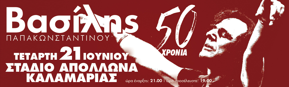 50 χρόνια κλείνει φέτος ο Βασίλης Παπακωνσταντίνου στην ελληνική δισκογραφία! Και τα γιορτάζει μαζί μας, με μια μεγάλη συναυλία – γιορτή στη Θεσσαλονίκη στο Στάδιο Απόλλωνα Καλαμαριάς.
