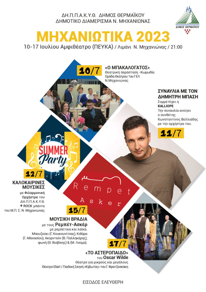 ΔΗ.Π.Π.Α.Κ.Υ.Θ. ΔΗΜΟΥ ΘΕΡΜΑΙΚΟΥ – ΔΗΜΟΤΙΚΗ ΚΟΙΝΟΤΗΤΑ ΝΕΑΣ ΜΗΧΑΝΙΩΝΑΣ Αμφιθέατρο (ΠΕΥΚΑ) και Λιμάνι Νέας Μηχανιώνας 21:00 έναρξη όλων των εκδηλώσεων – Είσοδος Ελεύθερη