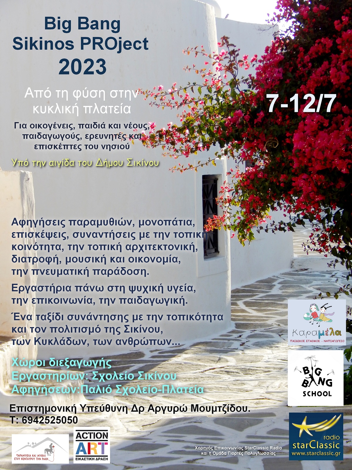Το Big Bang Sikinos Project, οργανώνει το BIG BANG ECOLE DU MONDE υπό την επιστημονική ευθύνη της Δρ Αργυρώς Μουμτζίδου , υπό την Αιγίδα του του Δήμου Σικίνου , την υποστήριξη του Star Classic Radio https://www.facebook.com/groups/328620714181 ,την υποστήριξη και συμμετοχή της Αction Art. Επιστημ.Υπεύθυνη τ: Δρ Αργυρώ Μουμτζίδου, 6942525050