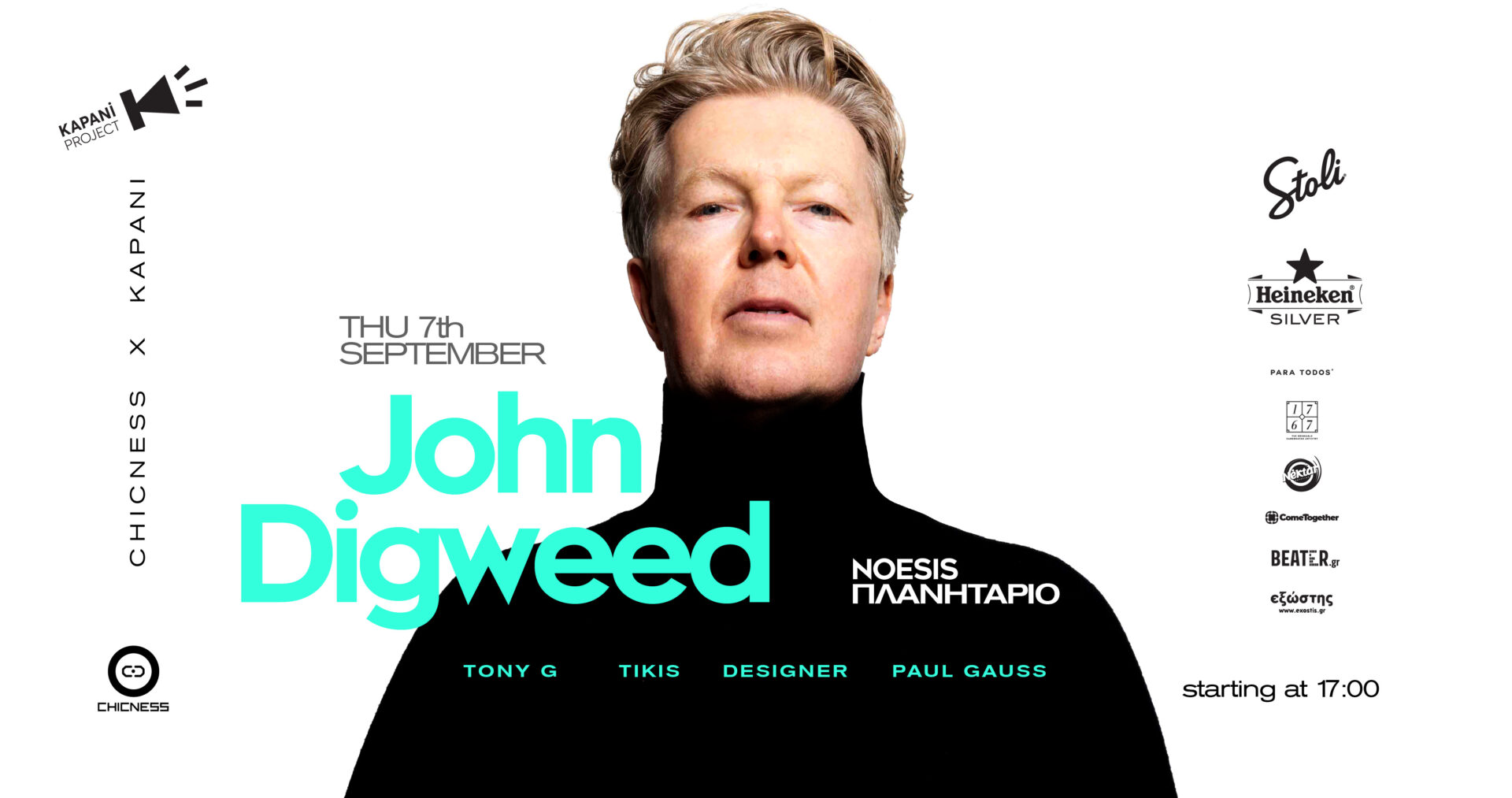 H ομάδα της Chicness και το Kapani Project ενώνουν τις δυνάμεις τους για δεύτερη φορά και παρουσιάζουν ένα μαγευτικό event ηλεκτρονικής μουσικής σ’ ένα από τους πιο εμβληματικούς χώρους της Θεσσαλονίκης. Την Πέμπτη 7 Σεπτεμβρίου, από τις 17:00 έως τις 00:00, στήνουν ένα μεγάλο party στον εξωτερικό χώρο του Noesis (Κέντρο Διάδοσης Επιστημών και Μουσείο Τεχνολογίας -ΝΟΗΣΙΣ). Υποδέχονται έναν θρυλικό Dj, ένα από τα σημαντικότερα ονόματα της dance electronica, τον John Digweed (Bedrock Records), μετά από αρκετά χρόνια, ξανά στην Θεσσαλονίκη! Ετοιμαστείτε για ένα μοναδικό party, σε ένα ειδυλλιακό τοπίο, όπου θα αιχμαλωτιστείτε από το ιδιαίτερο και εκρηκτικό set του John Digweed, που περιβάλλεται από μια μουσική ατμόσφαιρα μυστηρίου και ισχυρά grooves. O βρετανός super star αποτελεί τη ζωντανή ιστορία της dance μουσικής με μια πορεία 30 ετών. Ο John Digweed αποτελεί ένα σπάνιο φαινόμενο καλλιτέχνη που ανεξάρτητα από τις εκάστοτε μουσικές τάσεις πρωταγωνιστεί σε βάθος χρόνου, βασιζόμενος προπαντός στην ουσία της μουσικής του δημιουργικότητας. Από την εποχή που ασχολείτο με την acid house σκηνή μέχρι σήμερα έχει στο ενεργητικό του Mega Hits όπως ‘Heaven Scent’, ‘For What You Dream Of’ κ.α. Τα albums του Transitions, Bedrock και Structures κατέκτησαν τεράστια εμπορική επιτυχία, καθώς και την ευρεία αναγνώριση των κριτικών, ενώ η ραδιοφωνική εκπομπή του, Transitions, είναι από τις πλέον επιτυχημένες του είδους σε παγκόσμιο επίπεδο με κοινό που εκτείνεται σε 120 χώρες και ανέρχεται σε 24 εκατομμύρια ακροατές την εβδομάδα. Η επίδραση του John Digweed, στην παγκόσμια μουσική dance σκηνή είναι τεράστια και διευρύνεται συνεχώς, όπως αποδεικνύουν τα ασταμάτητα gigs και οι περιοδείες του ανά τον κόσμο. Είναι ο Dj των Djs. Η διαφορετικότητά του σε σχέση με τους υπόλοιπους είναι κι αυτό που τον χαρακτηρίζει. Τόσο στο ξεκίνημά του, όσο και τώρα που βρίσκεται στο αποκορύφωμα του διεθνούς dj set έχει δημιουργήσει και διατηρήσει ένα επίπεδο ακεραιότητας που είναι πια σημείο αναφοράς τόσο για τους djs όσο και για τους παραγωγούς παγκοσμίως. Πέρα από Dj, ο John Digweed, είναι και ένας από τους βασικούς δημιουργούς του πρωτοπόρου label, Bedrock. Έπειτα από τουλάχιστον 18 χρόνια αξιοσημείωτης δράσης, αποτελεί πλέον σημείο αναφοράς.