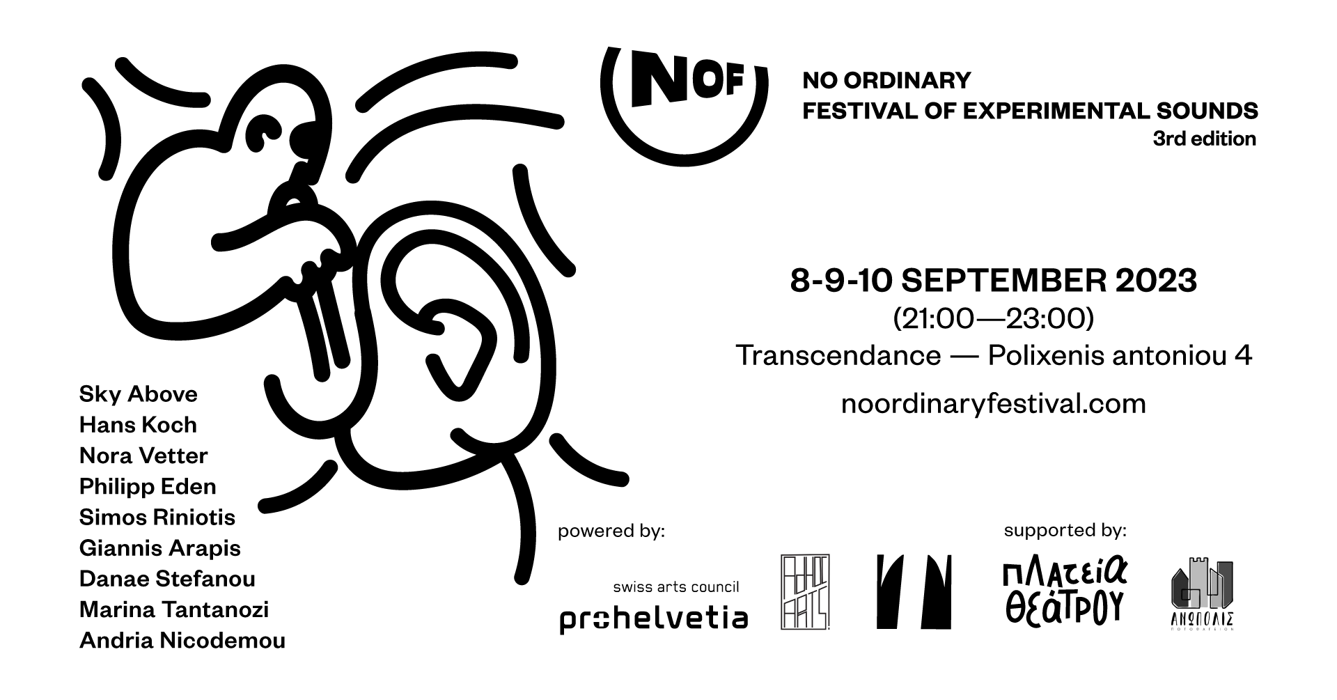 Η τρίτη εκδοχή του No Ordinary Festival θα πραγματοποιηθεί στο Transcendance – αγωγός τέχνης στη Θεσσαλονίκη στις 8,9 και 10 Σεπτεμβρίου 2023 παρουσιάζοντας έξι συναυλίες πειραματικής μουσικής. Η φετινή διοργάνωση του NOF εμβαθύνει στον ελεύθερο αυτοσχεδιασμό και στην διαπολιτισμική ανταλλαγή μεταξύ των πειραματικών σκηνών της Ελλάδας και της Ελβετίας. Εννέα αυτοσχεδιαστές/στριες από τις δύο χώρες και την Κύπρο θα συναντηθούν και θα παίξουν για πρώτη φορά μαζί !