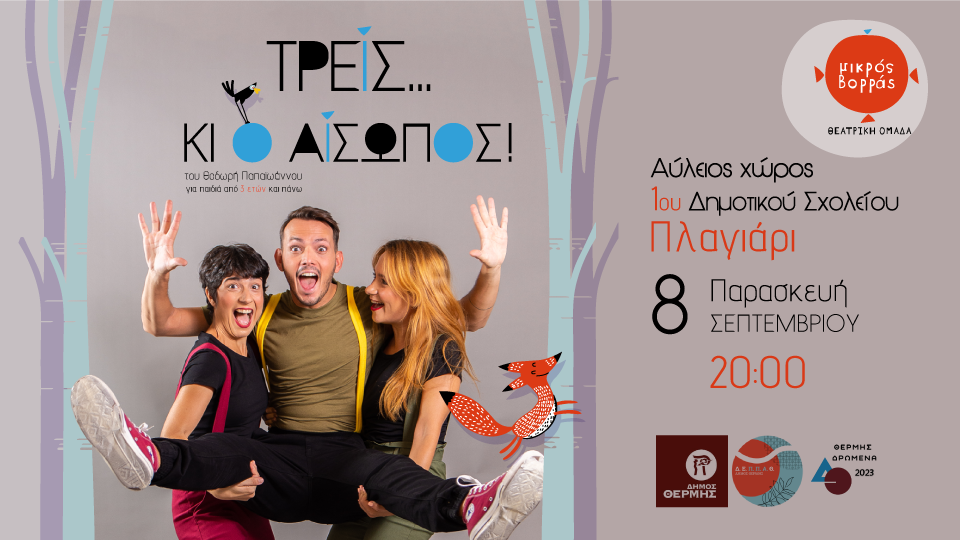 Παρασκευή 8 Σεπτεμβρίου – Θεατρική παράσταση «Τρεις… και ο Αίσωπος» Μικρός Βορράς– Πλαγιάρι – Αύλειος χώρος 1 ΟΥ δημοτικού σχολείου – 20.00