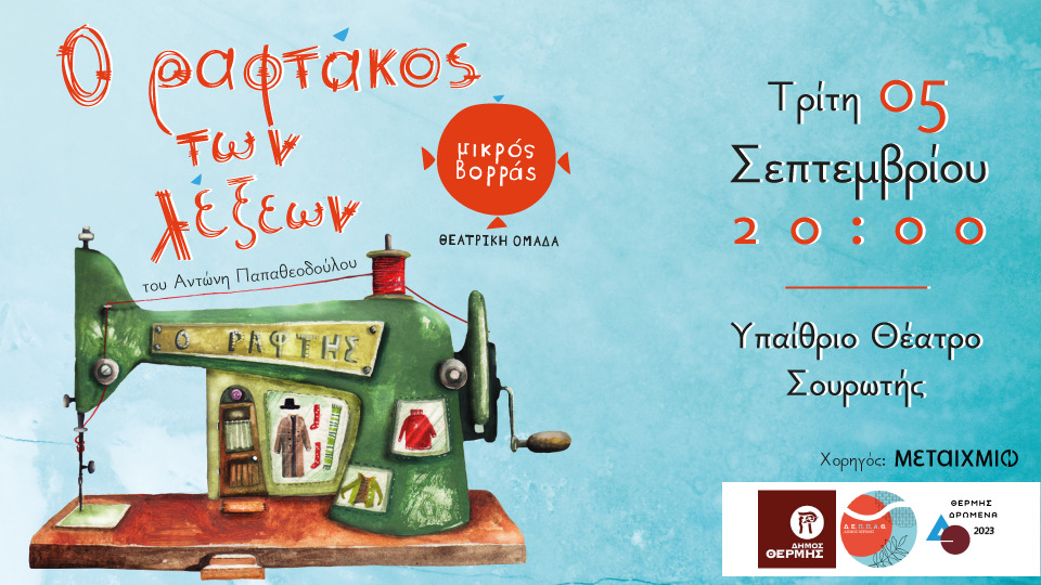 Τρίτη 5 Σεπτεμβρίου – Θεατρική παράσταση «Ο ραφτάκος των λέξεων» Μικρός Βορράς – Σουρωτή – Υπαίθριο Θέατρο Πολιτιστικού Κέντρου Σουρωτής – 20.00