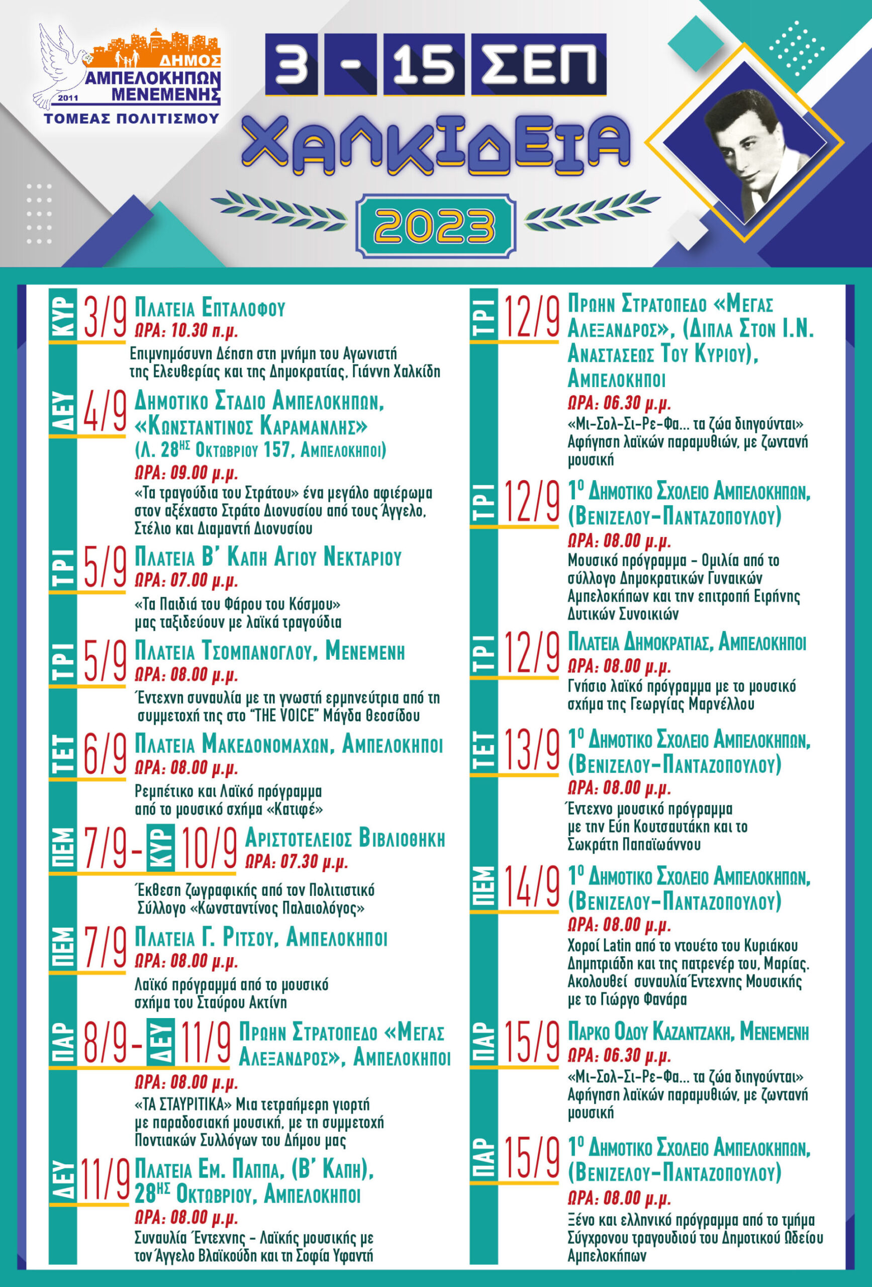Ο Δήμος Αμπελοκήπων-Μενεμένης τιμά και φέτος τη μνήμη του συμπολίτη μας Γιάννη Χαλκίδη με την ετήσια γιορτή “Χαλκίδεια 2023 & από τις 3 έως τις 15 Σεπτεμβρίου. Ξεκινάμε την Κυριακή 3 Σεπτεμβρίου στις 10.30 π.μ. στην πλατεία Επταλόφου όπου θα πραγματοποιηθεί επιμνημόσυνη Δέηση στη Μνήμη του Αγωνιστή της Δημοκρατίας Γιάννη Χαλκίδη.
