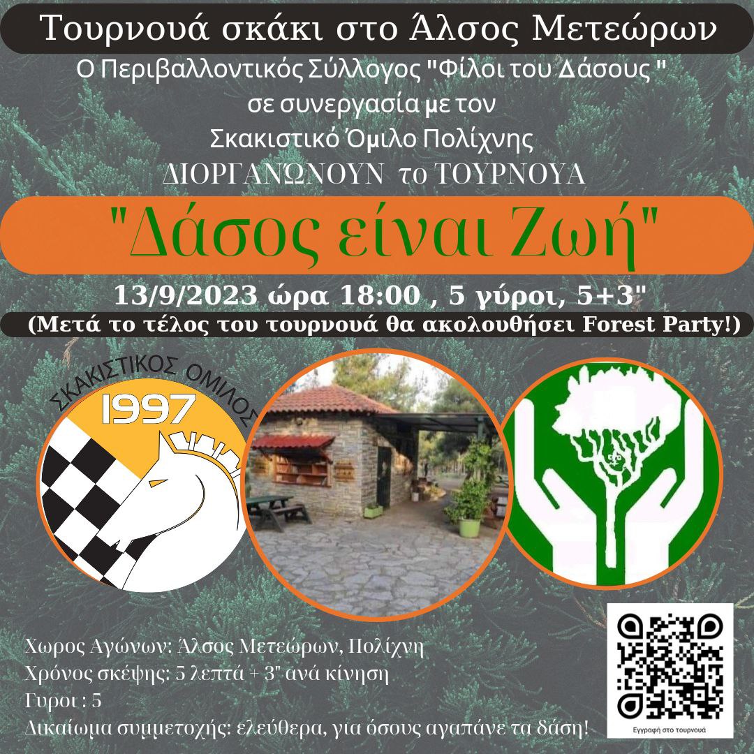 Τουρνουά Σκάκι στο Άλσος Μετεώρων Θεσσαλονίκης. Τετάρτη 13 Σεπτέμβρη 2023 18.00 στο κέντρο του Άλσους. Με κεντρικό σύνθημα το “Δάσος είναι Ζωή” ο Σκακιστικός Όμιλος Πολίχνης και ο Περιβαλλοντικός Σύλλογος οι Φίλοι του Δάσους συνδιοργανώνουν ένα πρωτότυπο απογευματινό τουρνουά σκάκι στην ύπαιθρο. Θα διεξαχθούν 5 Γύροι. Έναρξη 1ου γύρου: 18:00. Χρόνος σκέψης : 5’+3″.Δικαίωμα συμμετοχής: όσοι αγαπάνε τα δάση.