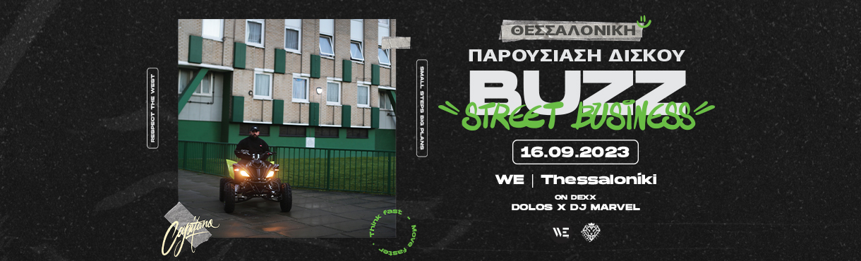 Ο ράπερ Buzz έρχεται στη Θεσσαλονίκη, το Σάββατο 16 Σεπτεμβρίου 2023 μία μεγάλη συναυλία στον πολυχώρο We στο κέντρο της πόλης, για τη ζωντανή παρουσίαση του νέου album “Street Business”.