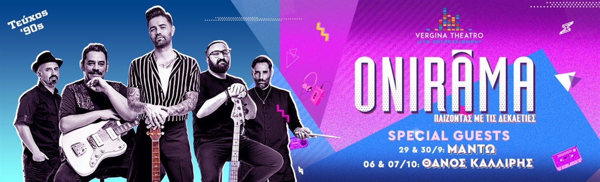 Οι Onirama παίζουν με τις δεκαετίες και ανεβαίνουν στη σκηνή του Vergina Theatro στη Θεσσαλονίκη, παρουσιάζοντας το απόλυτα πετυχημένο Project τους: «Mixin up the decades – Παίζοντας με τις δεκαετίες – Τεύχος 90s». Με special guests τη Μαντώ και το Θάνο Καλλίρη, δύο από τα τρανταχτά ονόματα της δεκαετίας του ’90, οι Onirama έρχονται να ταρακουνήσουν τη νύχτα στη Θεσσαλονίκη.