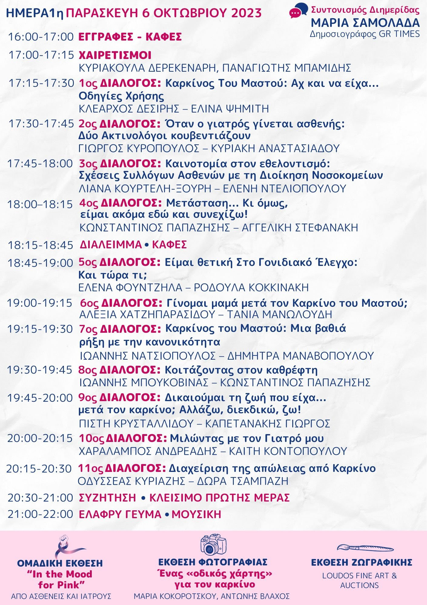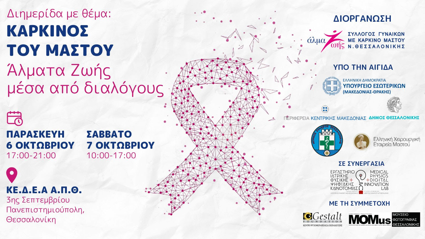 Διημερίδα με θέμα «Καρκίνος του Μαστού: Άλματα Ζωής μέσα από διαλόγους» 6 Οκτωβρίου (17:00-21:00) & 7 Οκτωβρίου 2023 (10:00-17:00), στο ΚΕ.Δ.Ε.Α Α.Π.Θ (Κόκκινο Κτήριο, 3ης Σεπτεμβρίου Πανεπιστημιούπολη, Θεσσαλονίκη) Είσοδος Ελεύθερη ,Θα δοθεί Βεβαίωση Συμμετοχής Μάθετε περισσότερα ακολουθώντας την εκδήλωση μας στο Facebook:ΔΙΗΜΕΡΙΔΑ: «Καρκίνος του Μαστού: Άλματα Ζωής μέσα από διαλόγους»