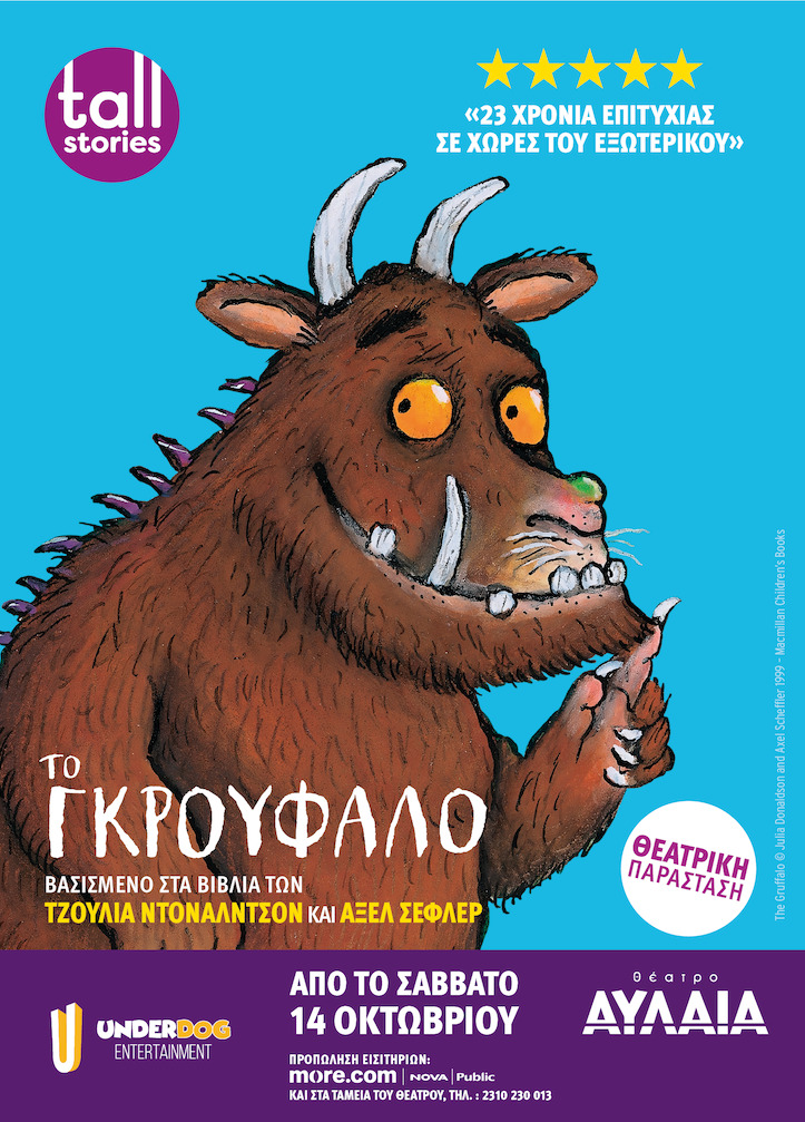 *Από το Σάββατο 14 Οκτωβρίου και κάθε Σάββατο στις 5.30 το απόγευμα και Κυριακή 11.30 το πρωί | Εισιτήρια από 12 Ευρώ στο www.more.com (πρώην viva) και στα ταμεία του Θεάτρου | Link εισιτηρίων: https://www.more.com/theater/children/to-gkroufalo | Διάρκεια παράστασης: 1 ώρα και 10 λεπτά με το διάλειμμα | Προτεινόμενες ηλικίες είναι 3 έως 8 ετών | Εισιτήρια πληρώνουν παιδιά από 2 ετών κι ενήλικες και έχουν θέση. Τα παιδιά μικρότερης ηλικίας μπορείτε να τα έχετε αγκαλιά | Καθημερινές παραστάσεις για σχολεία, επικοινωνήστε με το Θέατρο Αυλαία στο 2310-230013 και online στο: https://www.underdogent.com/schools | Μία παραγωγή της Underdog Entertainment σε συνεργασία με την Αγγλική εταιρία θεάτρου Tall Stories UK